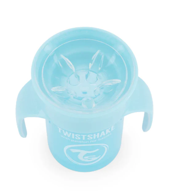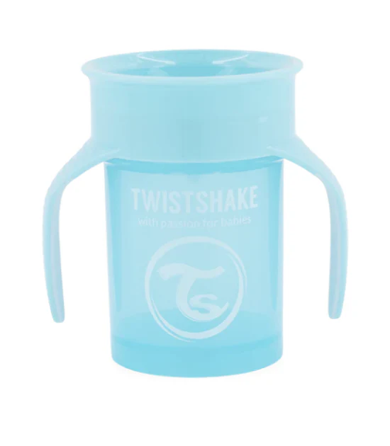 Twistshake 360 Cup est une tasse d’apprentissage pour les jeunes enfants sans bec verseur, recommandée par les dentistes. La tasse à 360° est dotée d’un rebord qui permet à l’enfant de boire de n’importe quel côté : il lui suffit d’incliner la tasse et d’aspirer sur le rebord de la valve.