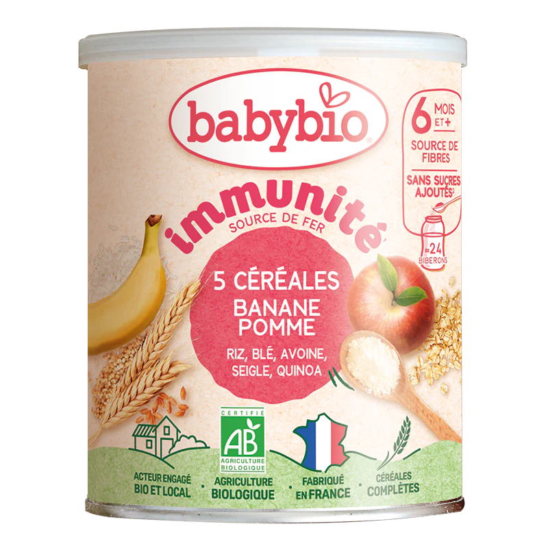 Une recette source de fer* qui soutient le système immunitaire ! Avec de la vitamine B1**, du fer et des céréales complètes bio (Riz, Blé, Avoine, Seigle, Quinoa) mélangés à de la banane et de la pomme pour la gourmandise. Quelques cuillères dans du lait infantile suffisent à régaler bébé.