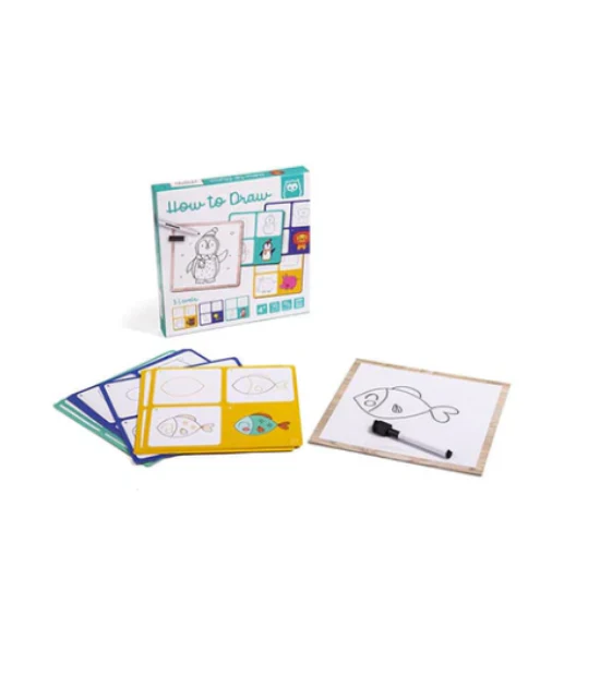 Jeu pour apprendre à dessiner et développer la coordination œil-main et la créativité. Il sert à apprendre à dessiner pas à pas à l’aide de pochoirs. Le jeu a trois niveaux de difficulté : jaune, bleu et turquoise.