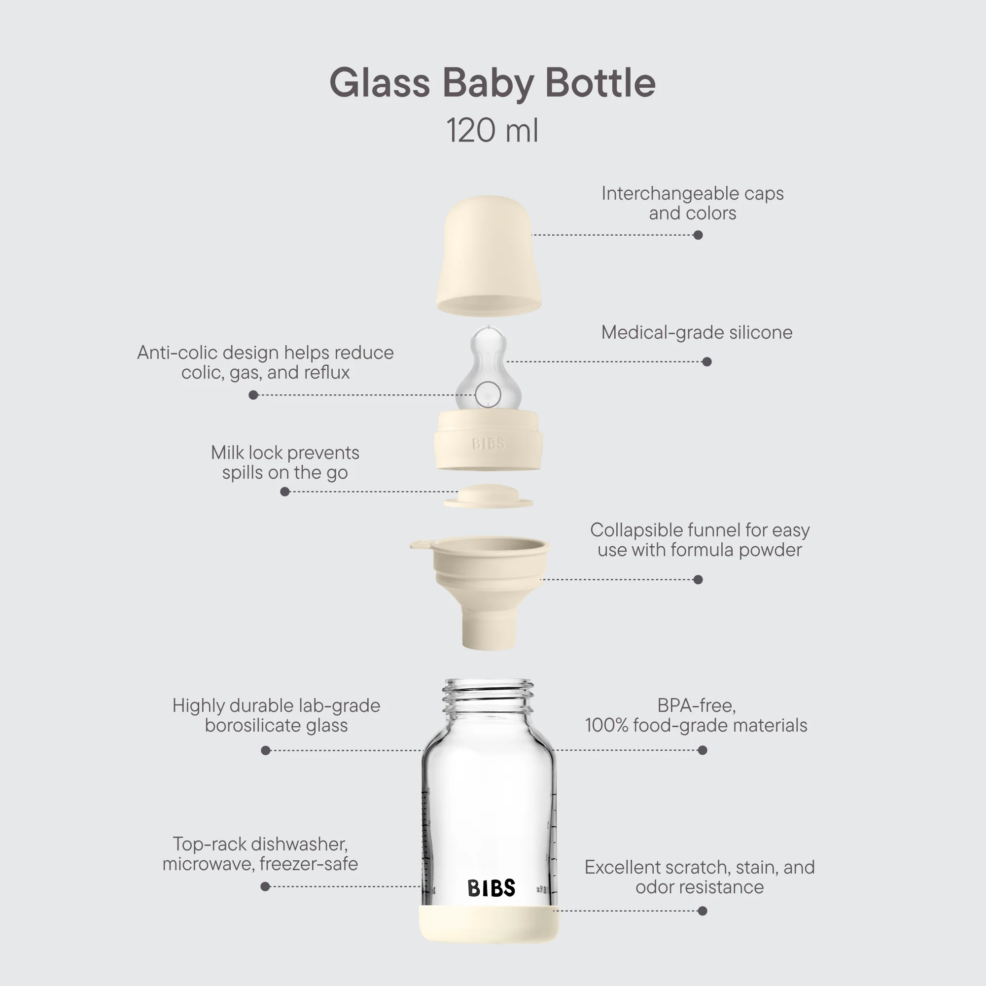Le BIBS Baby Bottle 120ml est conçu en verre borosilicaté de qualité laboratoire, réputé pour sa résistance et sa pureté.