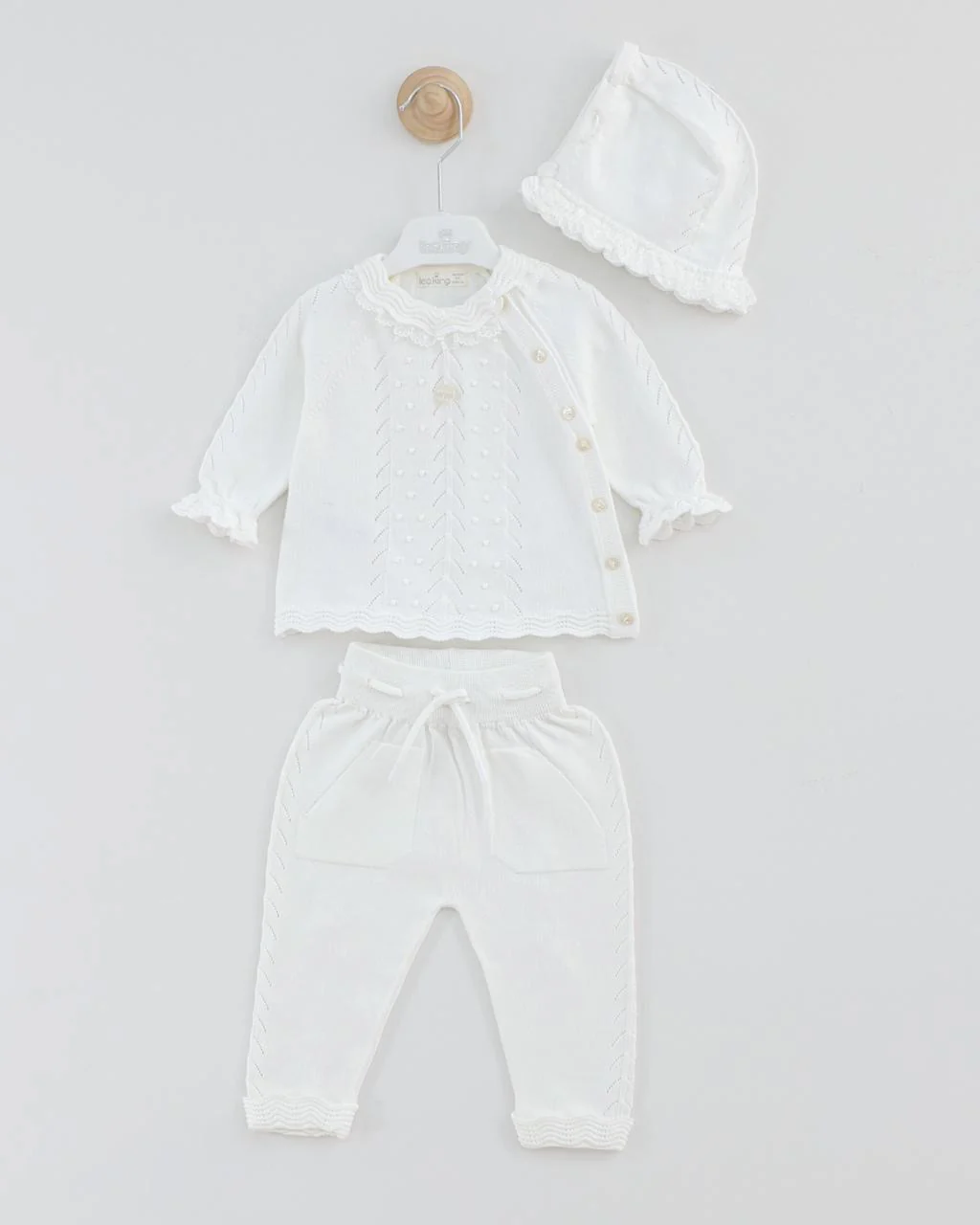 Le bonnet ajoute une touche de chaleur et complète parfaitement le look. Un indispensable du trousseau de naissance, à la fois pratique et plein de tendresse.
