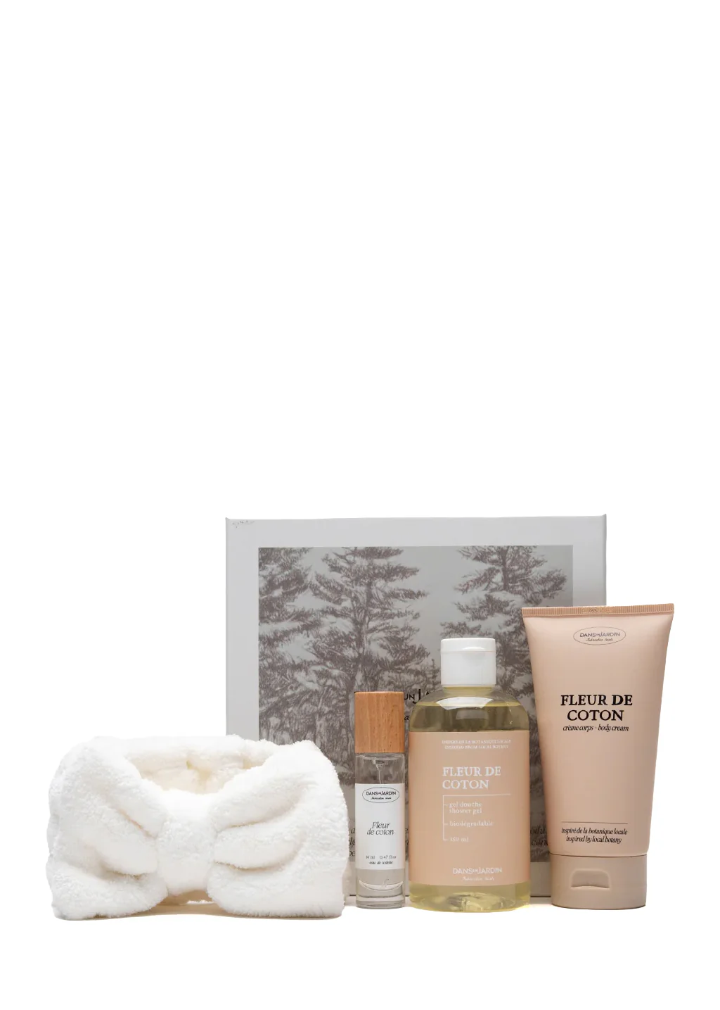 Un coffret doux et raffiné pour une pause bien-être. Il comprend un gel douche, une crème corps, une eau de toilette, et un bandeau blanc tout doux, présentés dans une jolie boîte décorative. Un parfum délicat de fleur de coton, à la fois pur, réconfortant et élégant.