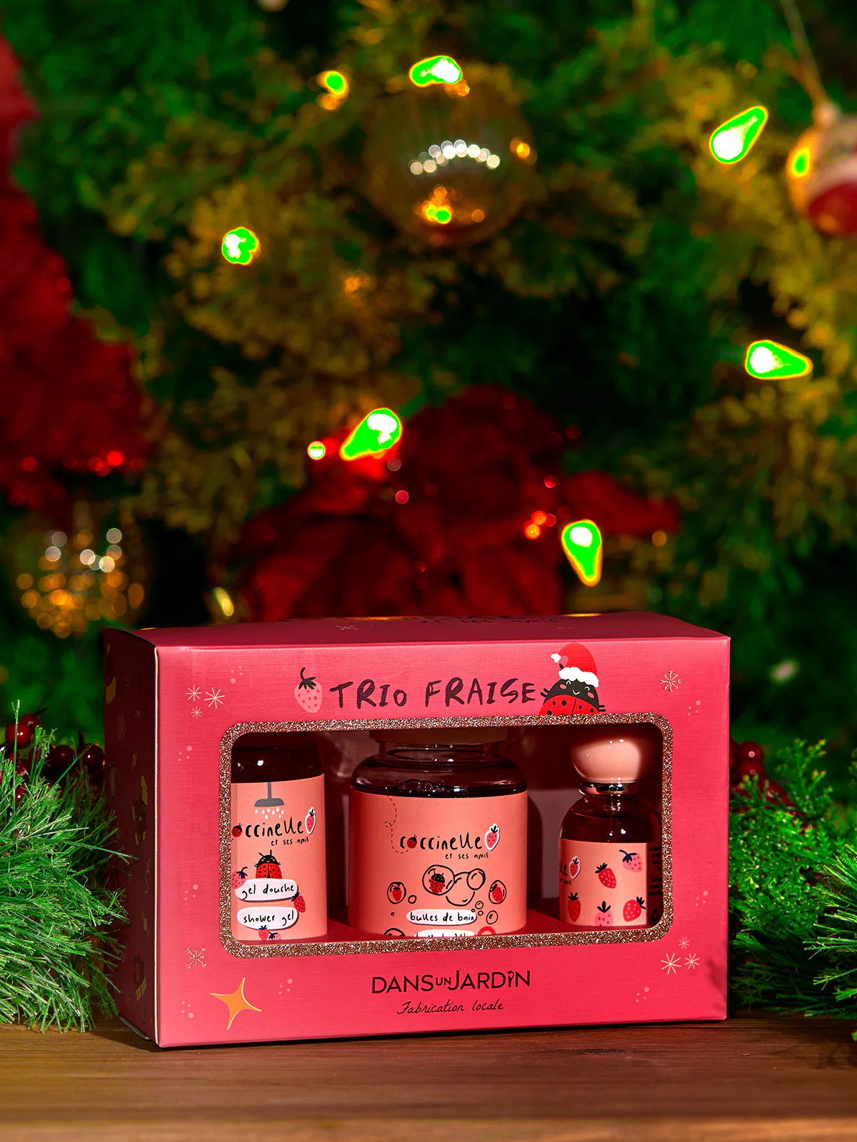 L’ensemble cadeau fraise contient : l’eau de toilette fraise (30 ML), le gel douche fraise (190 ML) et les bulles de bain fraise (200 ML).