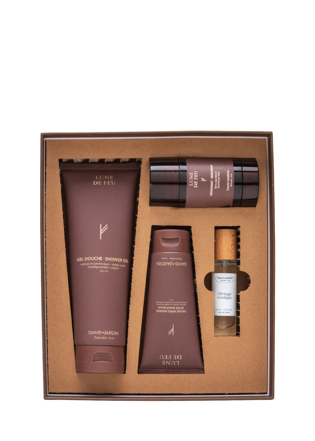 Ensemble cadeau pour homme LUNE DE FEU offrant énergie et revitalisation. L’ensemble comprend un gel douche végane (250 ml), une eau de toilette (14 ml), un déodorant et un baume après-rasage (75 ml) apportant confort et vitalité à la peau.
