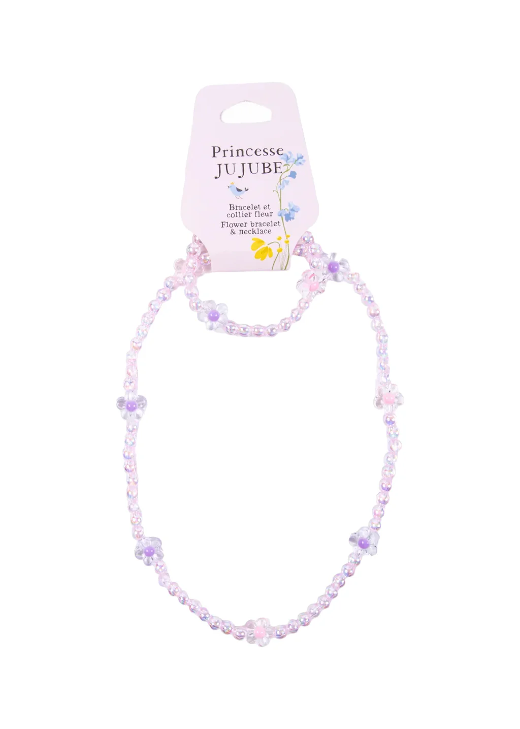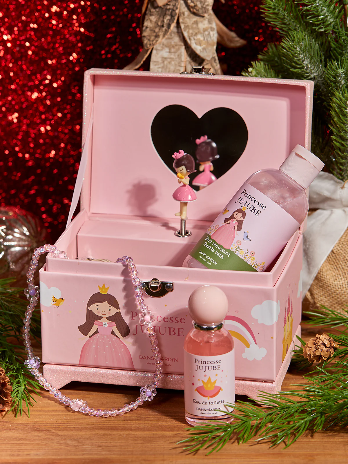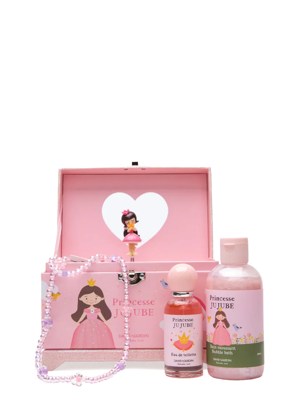 L’ensemble cadeau Princesse Jujube contient : l’eau de toilette Princesse Jujube (30 ML), le bain moussant Princesse Jujube (200 ML), et le bracelet et collier fleur.