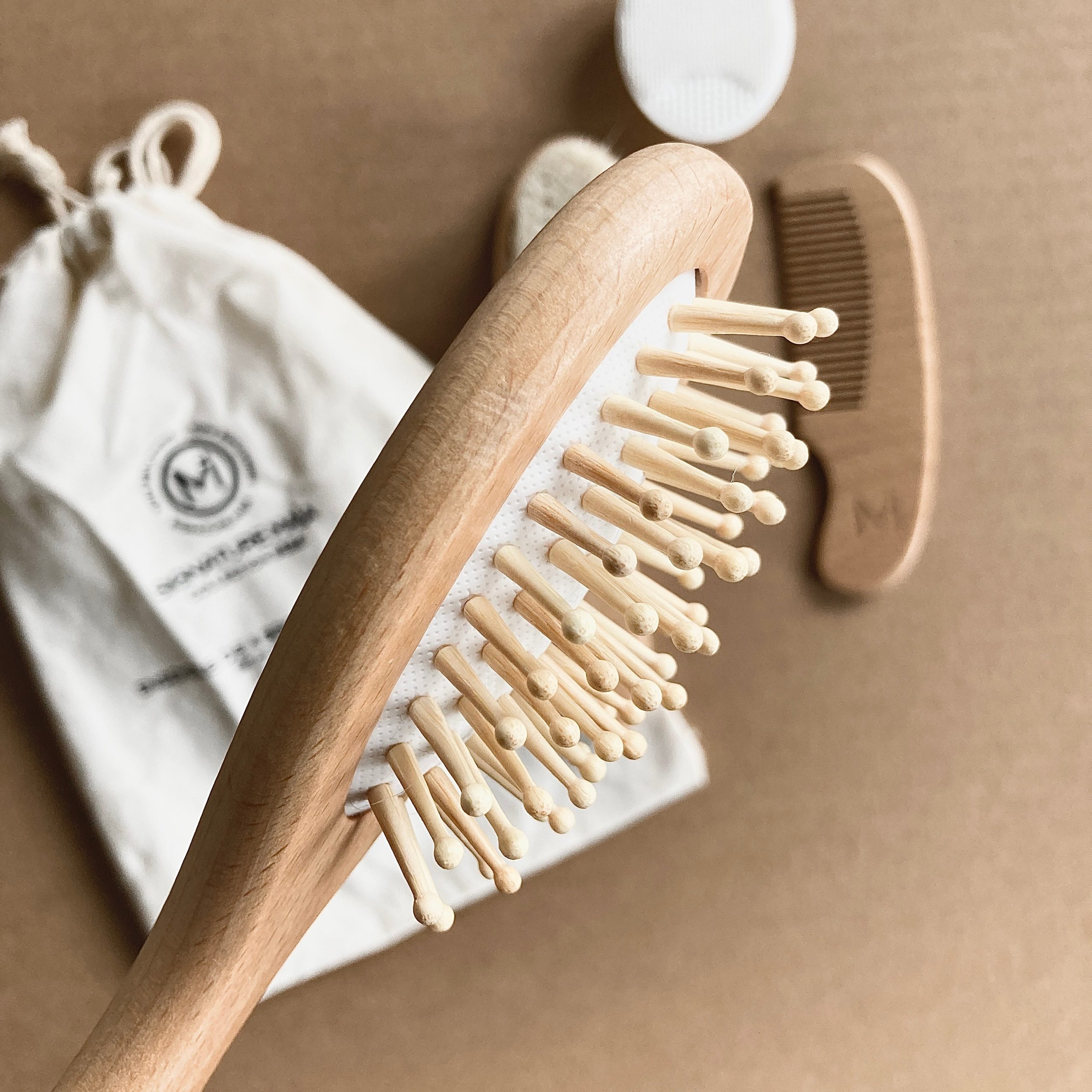 • UNE BROSSE EN BOIS pour peigner les cheveux de bébé ou encore pour masser sa tête.
