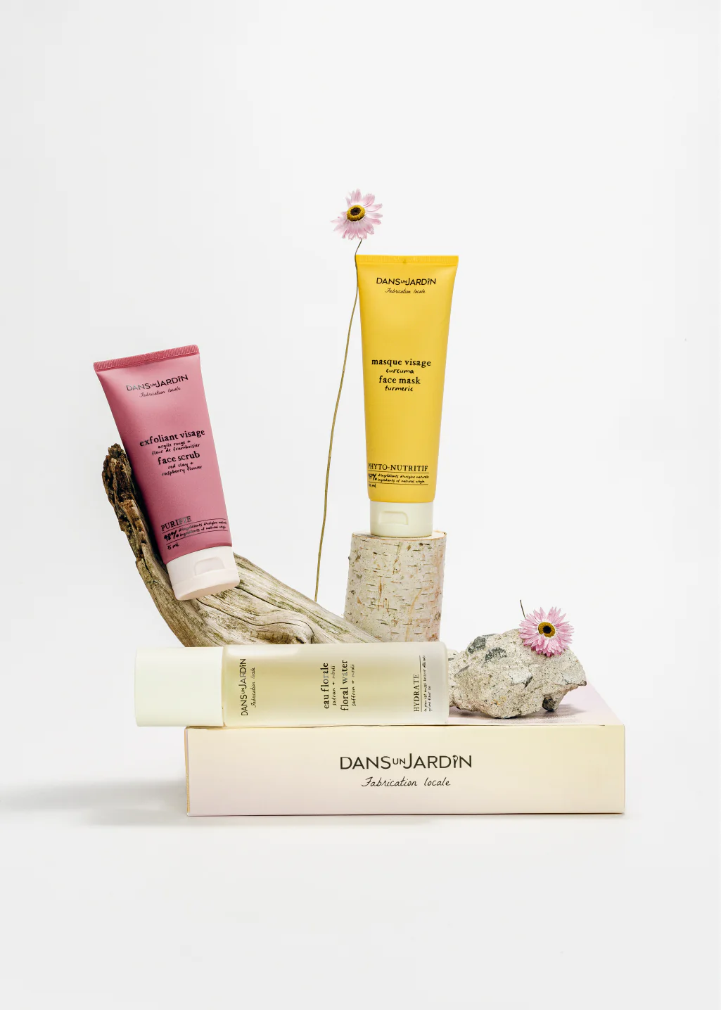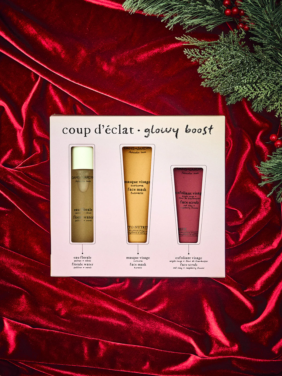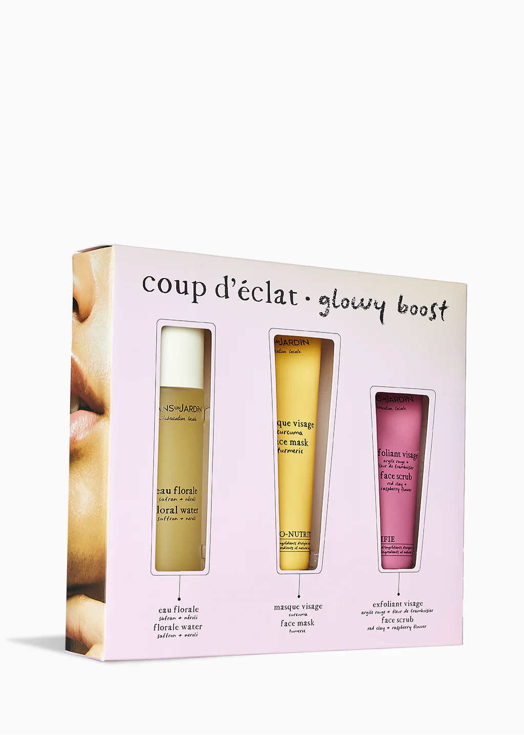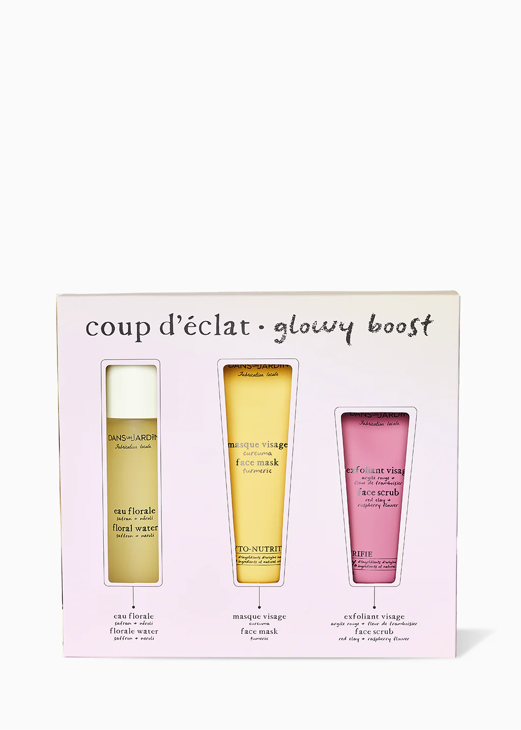 Contient: Eau florale – safran + néroli, Masque visage – curcuma et Exfoliant visage – argile rouge + fleur de framboisier.