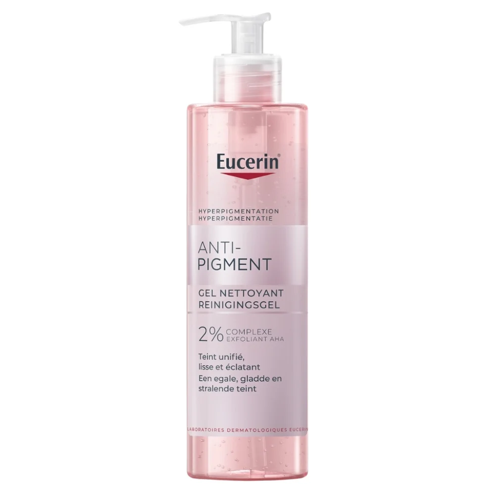 Le Gel Nettoyant ANTI PIGMENT d’EUCERIN, formulé à base d’acides lactique et glycolique, exfolie les cellules mortes pour un teint unifié, lisse et éclatant.
