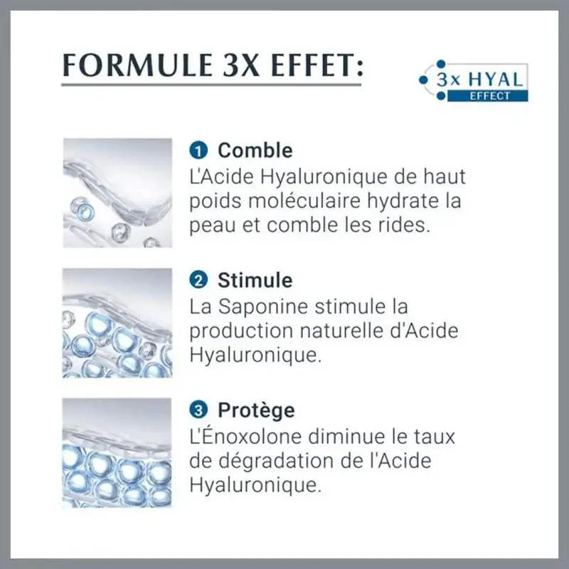 3. Protège : le taux de dégradation de l’Acide Hyaluronique est diminué grâce à l’Enoxolone.