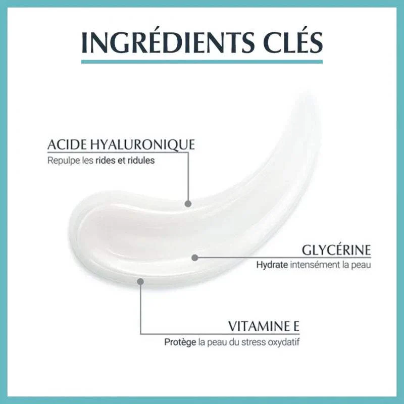 Cette formule, à la texture ultra légère et efficace pendant la nuit, combine de l’Acide Hyaluronique de haut poids moléculaire, qui fixe l’eau au niveau de la surface de la peau, et de l’Acide Hyaluronique de bas poids moléculaire, qui pénètre plus en profondeur de l’épiderme. Contenant également de la Glycérine, la formule hydrate intensément et significativement la peau. La ProVitamine B5 régénère activement et renforce la peau durant la nuit, tandis que la Vitamine E protège la peau du stress oxydatif.