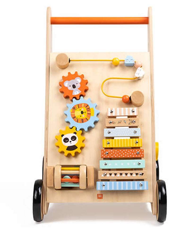 Un trotteur multifonctionnel très coloré qui propose des activités pour votre enfant avec sur la face avant un xylophone, un rouleau avec des boules, un boulier et des engrenages et sur les côtés une boite à formes et un descendeur. A l’arrière se trouve un compartiment pour réceptionner les 3 formes ou transporter ses jouets ou ses doudous.