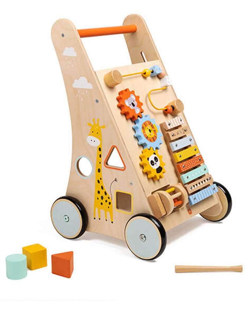 Un trotteur multifonctionnel très coloré qui propose des activités pour votre enfant avec sur la face avant un xylophone, un rouleau avec des boules, un boulier et des engrenages et sur les côtés une boite à formes et un descendeur. A l’arrière se trouve un compartiment pour réceptionner les 3 formes ou transporter ses jouets ou ses doudous.