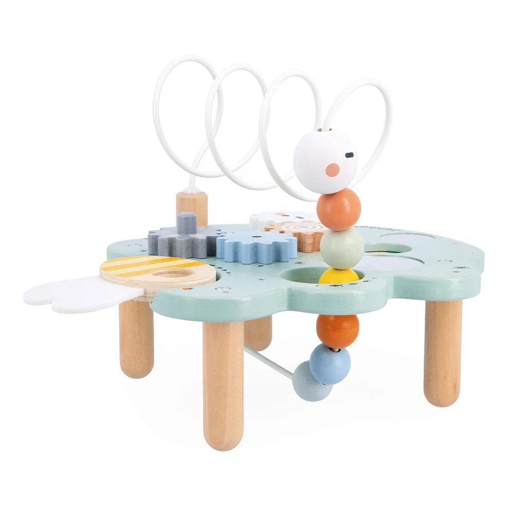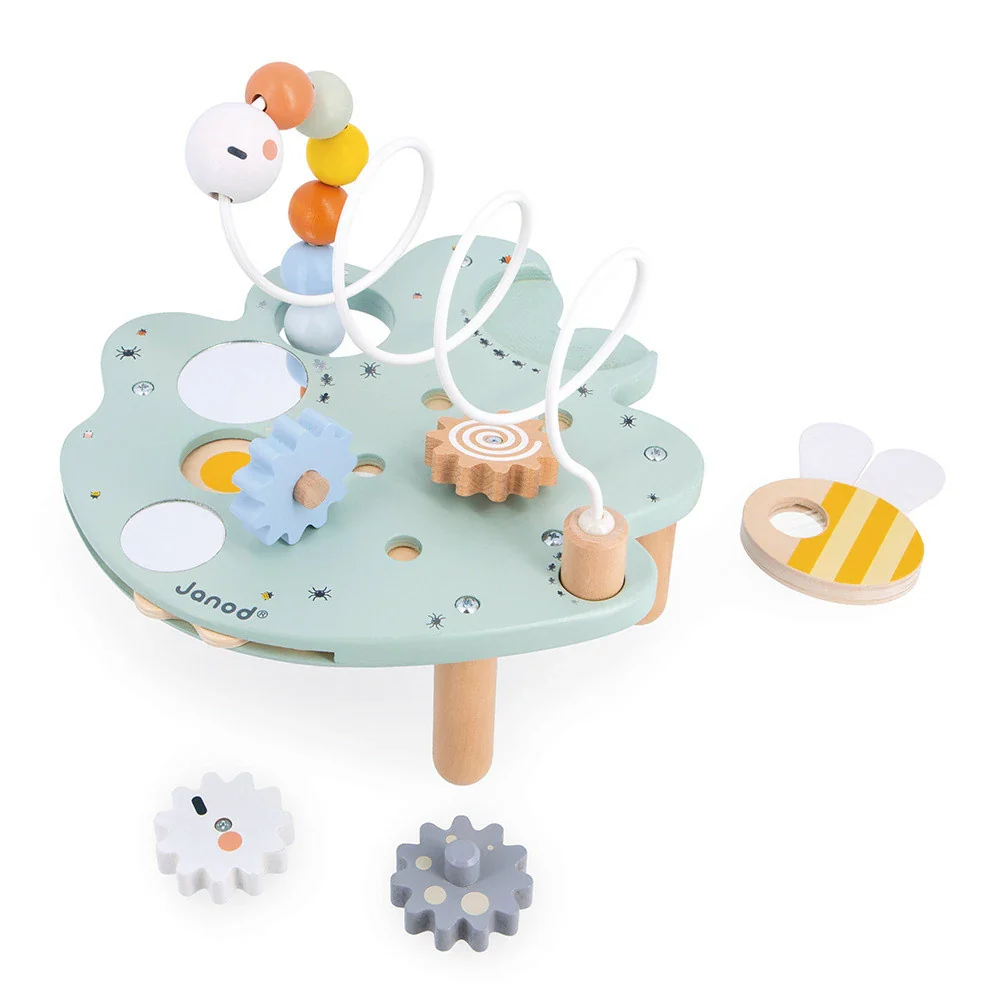Une feuille d’activités à croquer, ou presque … Ce jouet d’éveil propose une multitude d’activités amusantes pour bébé, dès 18 mois. Au programme : motricité, observation et éveil des sens ! 5 activités sont incluses au total : 4 engrenages à faire tourner à l’infini, 2 miroirs pour s’observer, 1 roue des couleurs sous forme de molette, 1 loupe en forme d’abeille pour prendre le temps de découvrir tous les petits insectes qui décorent la feuille, et 1 looping géante en forme de chenille à faire coulisser. Avec son jouet premier âge, votre bébé apprend à être curieux en manipulant les éléments pour découvrir les surprises qu’ils renferment ! Tous les éléments de ce jouet d’activité sont facilement manipulables par les petites mains potelées, et ont été pensé pour stimuler la vue et la motricité fine des petits. Ils pourront aussi commencer à apprendre les couleurs, les formes et même de nouveaux mots en observant les petites bêtes du jardin représentées sur la feuille. Facile à poser au niveau de bébé, ce jeu de manipulation promet de longs moments d’apprentissage et de découverte. Il invite votre enfant dans l’univers du jardin, lieu propice à l’exploration dès son plus jeune âge. Ce jouet d’éveil en bois fait partie de notre collection Sweet Cocoon. Durable, il est composé de bois certifié FSC™.