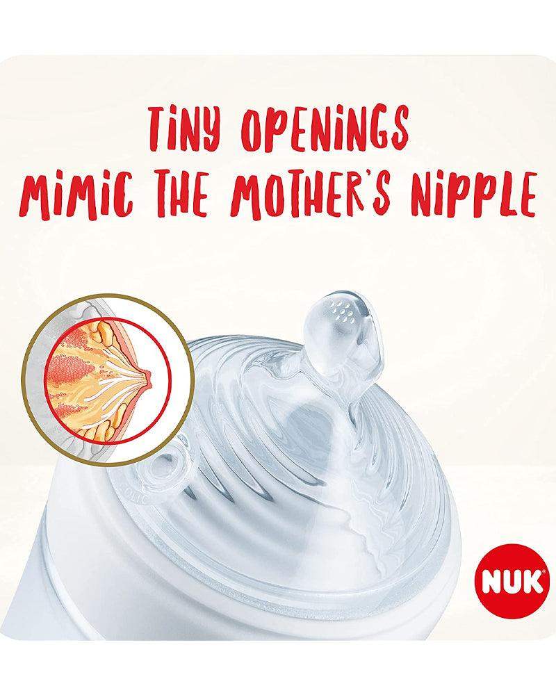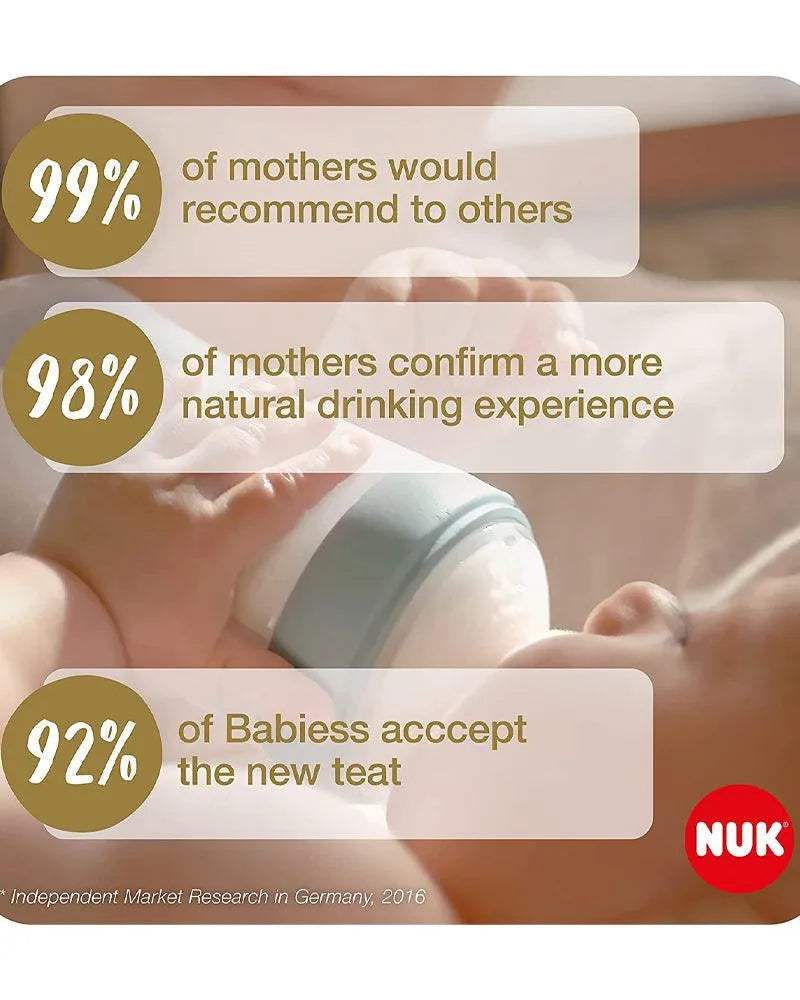 Inspirées de la forme du mamelon de la mère pendant l’allaitement, les tétines NUK encouragent la prise du sein et aident à prévenir la confusion du mamelon.