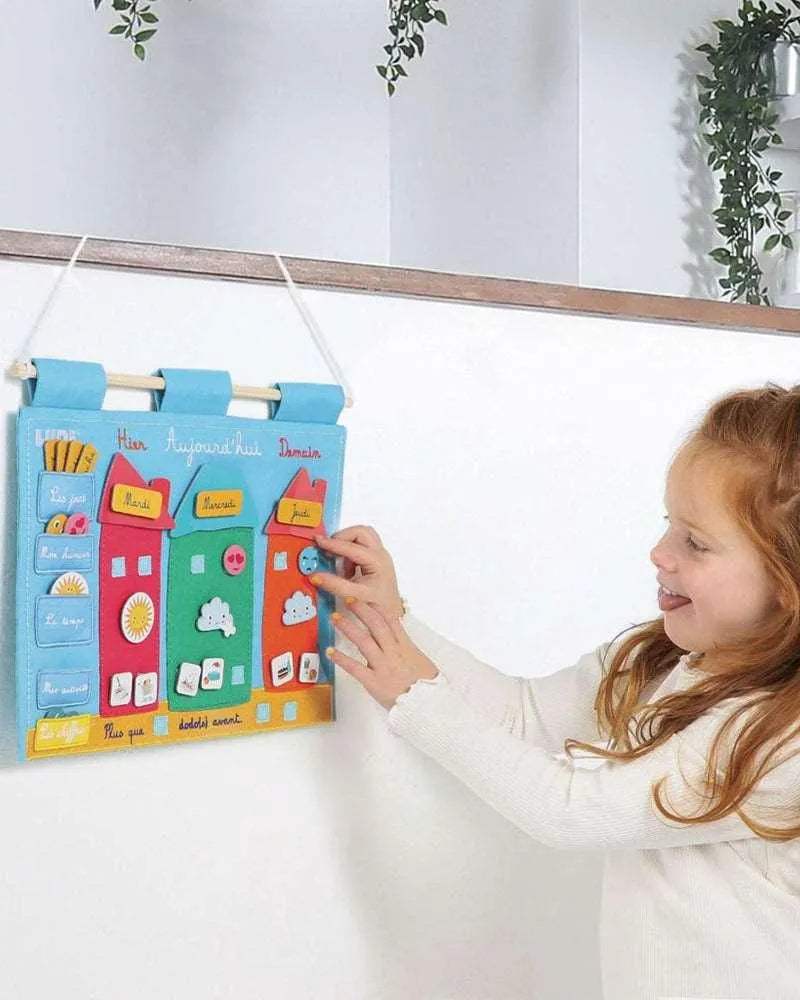 Le panneau organisateur est composé de 3 maisons « hier », « aujourd’hui » et « demain ». Les enfants piochent, dans les petites pochettes dédiées, le jour de la semaine, l’humeur qui lui correspond, la météo et ses deux activités principales de la journée.