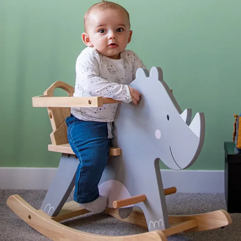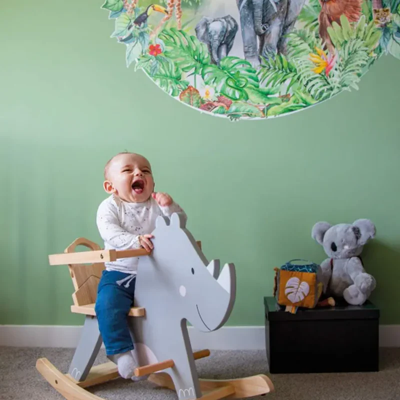 This wooden rocking rhino will be a real eye-catcher in your baby’s nursery or playroom! Made from sturdy solid wood, it has an enclosed seat to ensure your child’s safety. The rhino rocks back and forth, providing endless moments of fun.