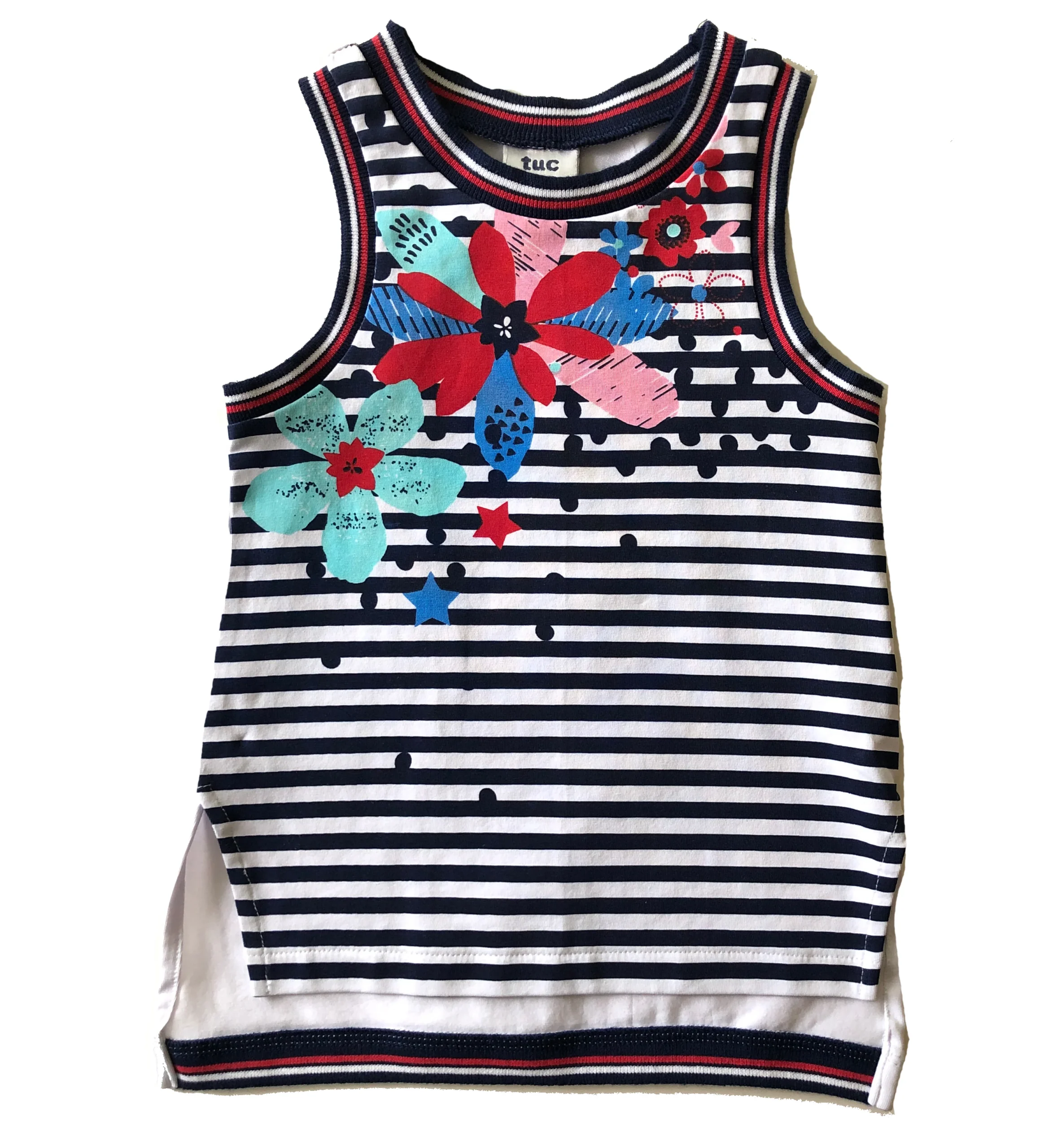 Camisole rayé blanc et marine motif fleur. Dos blanc avec coeur brodé