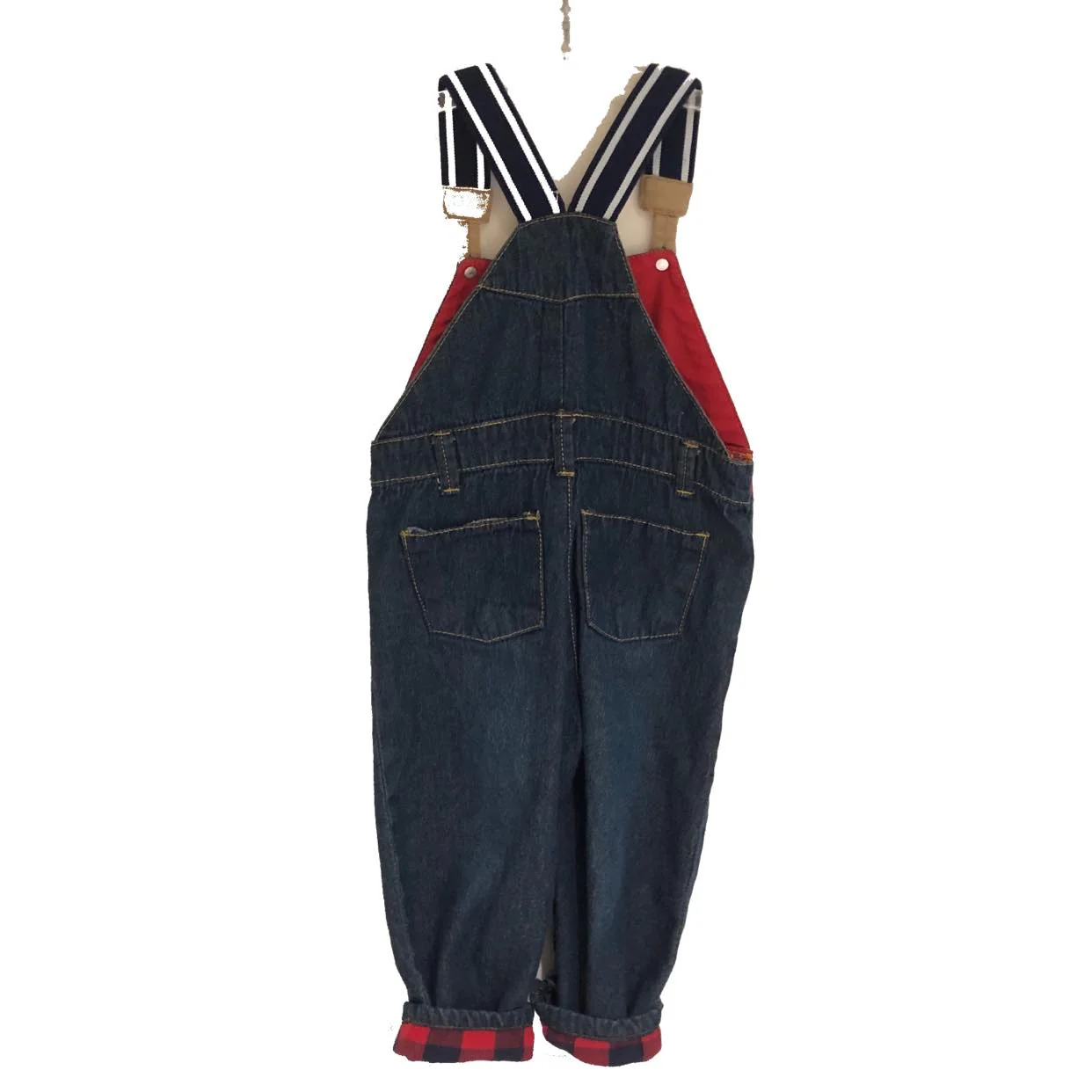 Salopette denim intérieur rouge et bretelle élastique marine ligne blanche. Boutons pressions dans l’entre jambe pour faciliter le changement de couches.