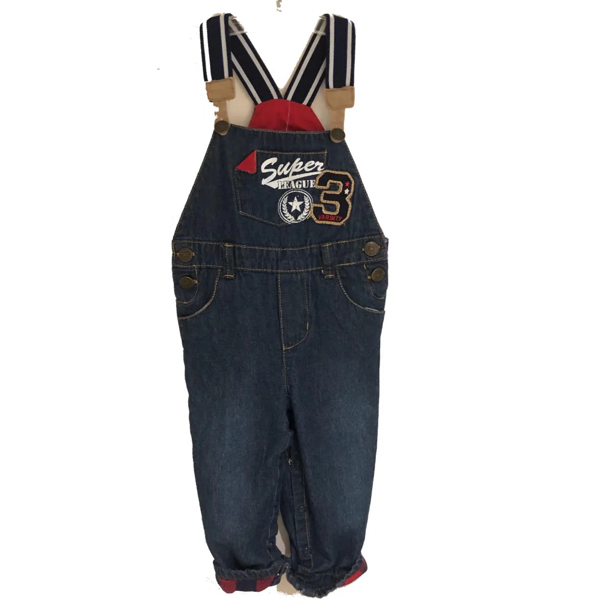 Salopette denim intérieur rouge et bretelle élastique marine ligne blanche. Boutons pressions dans l’entre jambe pour faciliter le changement de couches. Marque: Varsity Taille: 18ms Bon État