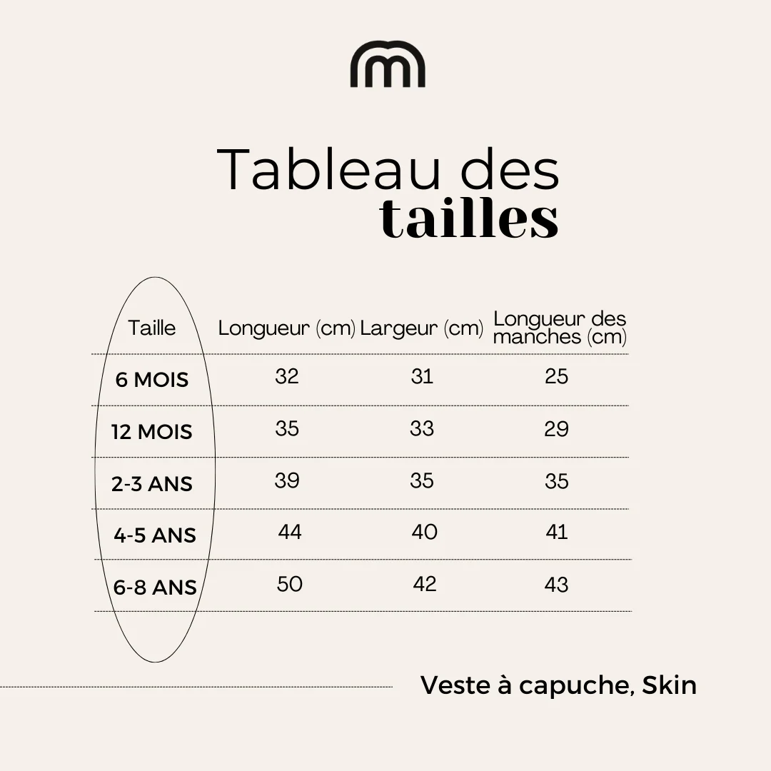 Info taille : La veste à capuche taille correctement, prendre sa taille habituelle. Sur les photo, June porte la taille 4-5 ans et fait du 5 ans habituellement. Pour plus de précision, référez vous au tableau des tailles.
